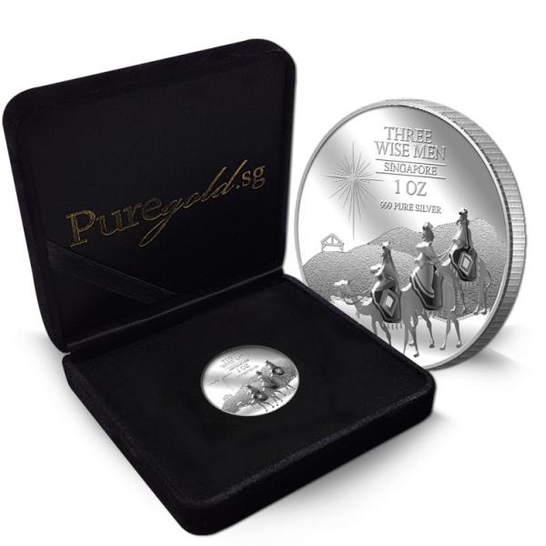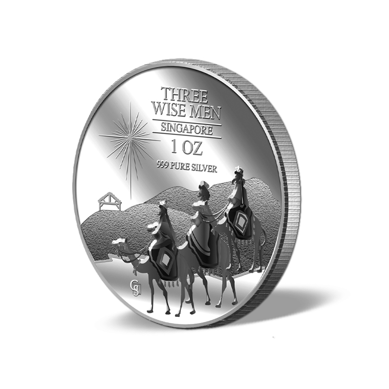The images of Three Wise Men are embossed on a 1Oz 999 fine silver medallion.