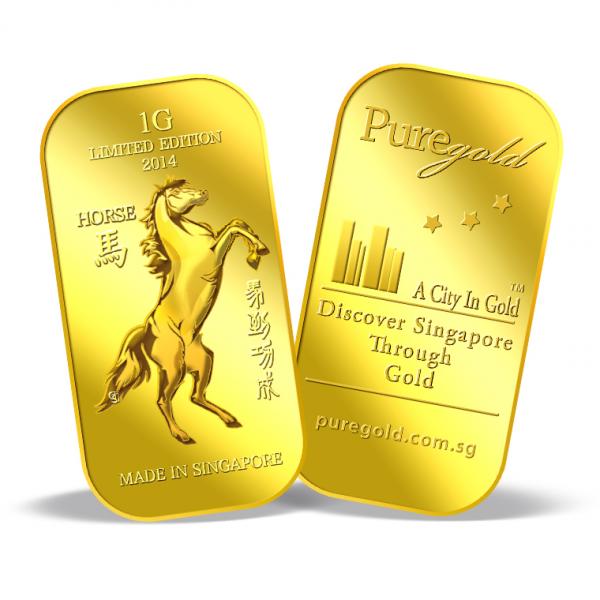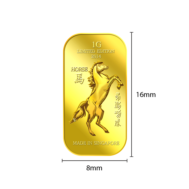 The 1g Horse Gold Bar design portrays an image of a horse rearing up. The design also includes the inscription LIMITED EDITION 2014, HORSE, 馬, ancient Chinese writing of 馬到成功, MADE IN SINGAPORE and the Medallion’s weight.