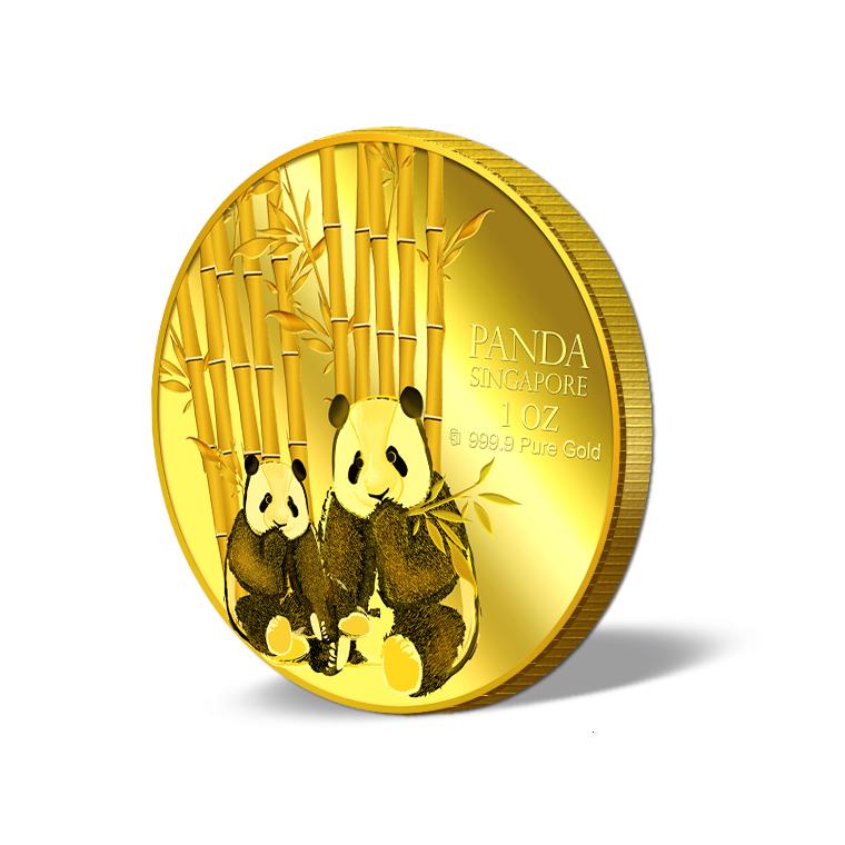 The Giant Pandas gold Medallion design portrays two giant pandas resting by a cluster of bamboo plants, which are the main food source of giant pandas. The design also includes the inscription PANDA SINGAPORE, the Medallion’s weight and fineness, and GoldSilver Refinery’s “GS” logo mark.
