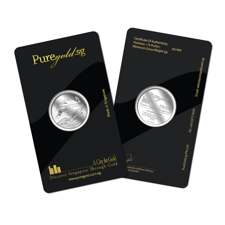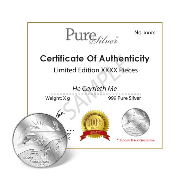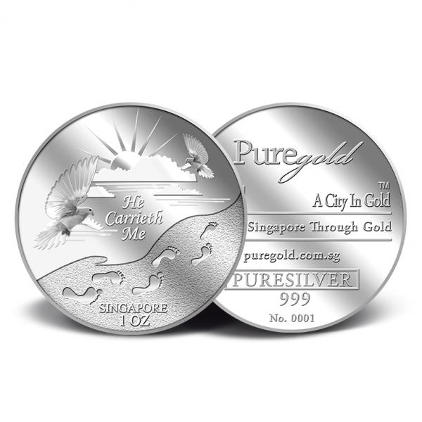 The He Carrieth Me silver medallion design portrays a beautiful image of the sun rising from behind the clouds, two doves, and a set of footprints. The design also includes the inscription HE CARRIETH ME, SINGAPORE, the medallion’s weight and GoldSilver Refinery’s “GS” logo mark.