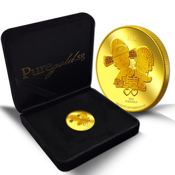 The Double Happiness gold Medallion design portrays a beautiful image a groom and a bride in traditional Chinese wedding costumes, behind the Chinese ligature of “Double Happiness”. The design also includes the inscription PRODUCT OF PUREGOLD.SG, as well as the Medallion’s weight and fineness.