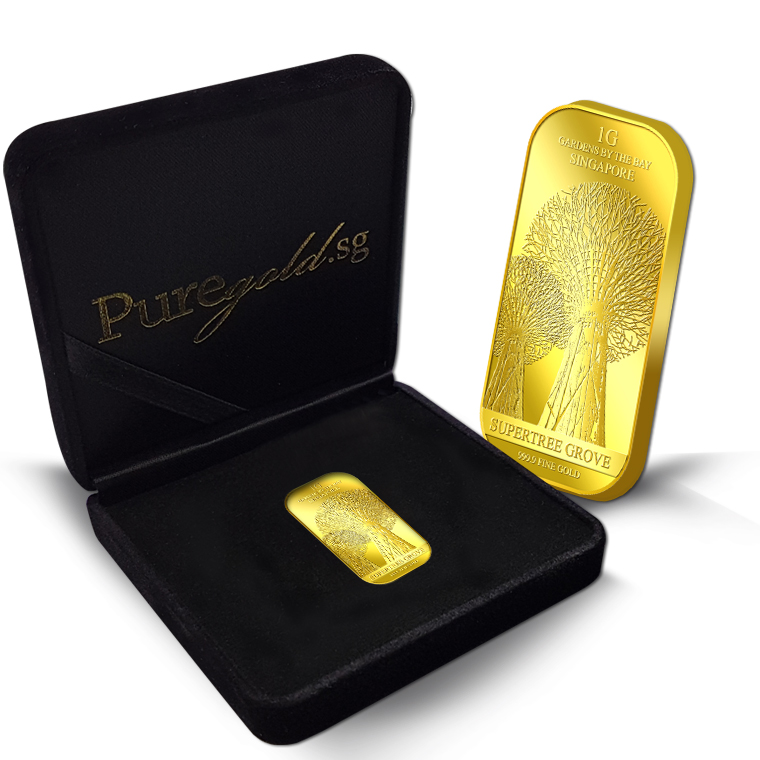 The image of the SuperTree Grove are embossed on a 1g 999.9 fine gold bar.