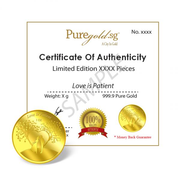 The Love is Patient gold Medallion design portrays a beautiful image a groom and a bride.