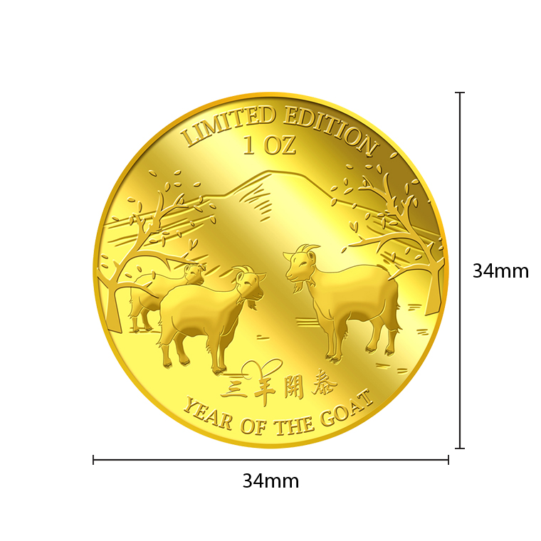 The 1oz Year of the Goat gold Medallion design portrays an image of three goats on a pasture, against the backdrop of trees and a mountain. The design also includes the inscription LIMITED EDITION, YEAR OF THE GOAT, 三羊開泰and the Medallion’s weight.