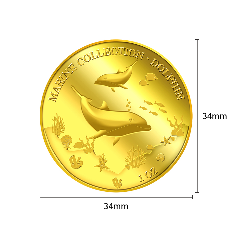 The image of the two dolphins is embossed on a 1oz 999.9 fine gold Medallion.