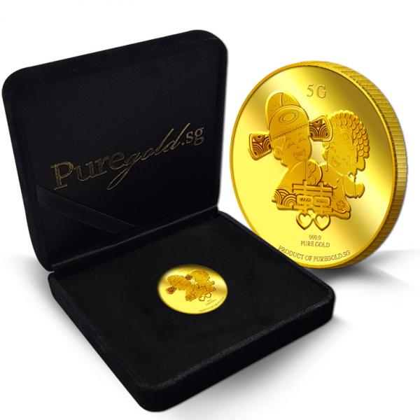 The Double Happiness gold Medallion design portrays a beautiful image a groom and a bride in traditional Chinese wedding costumes, behind the Chinese ligature of “Double Happiness”. The design also includes the inscription PRODUCT OF PUREGOLD.SG, as well as the Medallion’s weight and fineness.