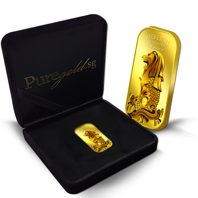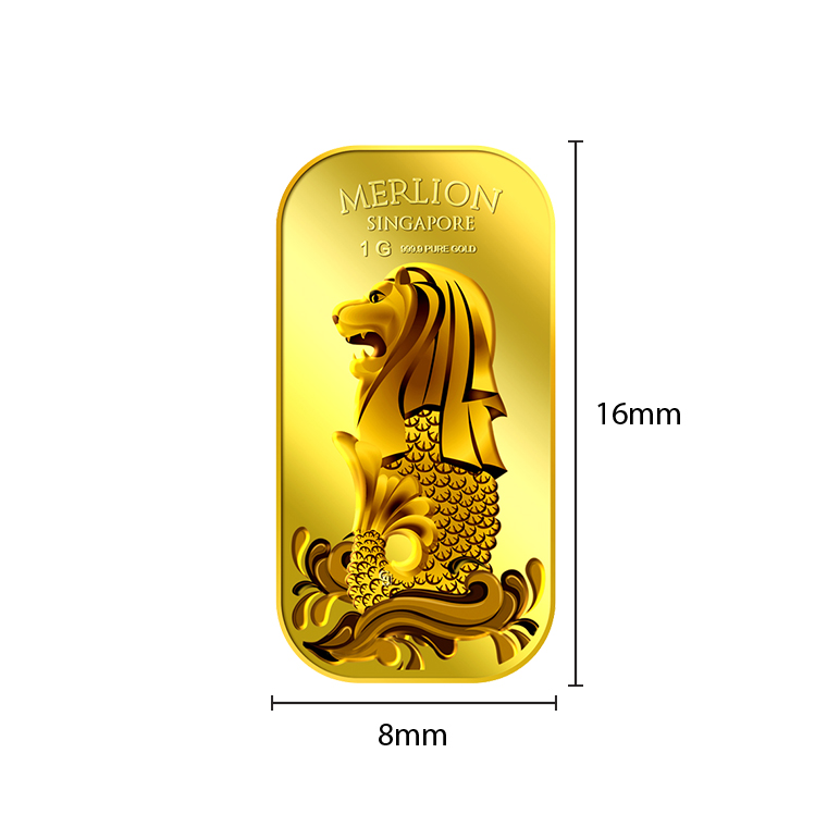 The image of the Singapore Merlion is embossed on a 1g 999.9 fine gold bar.