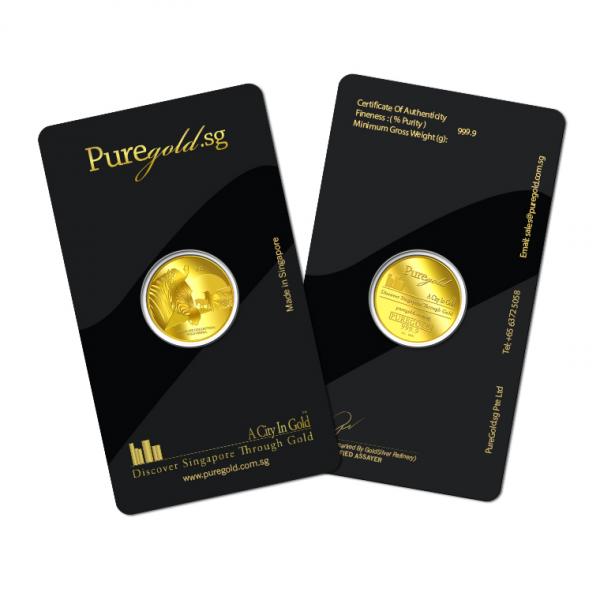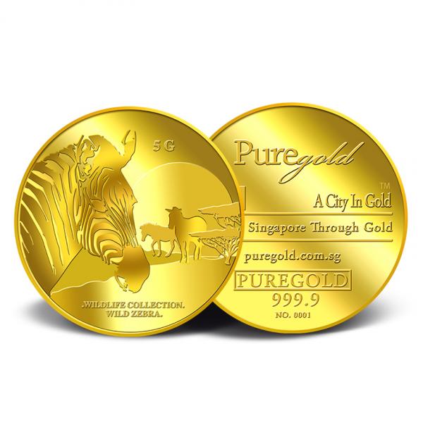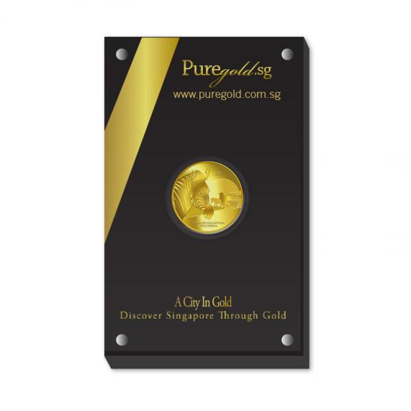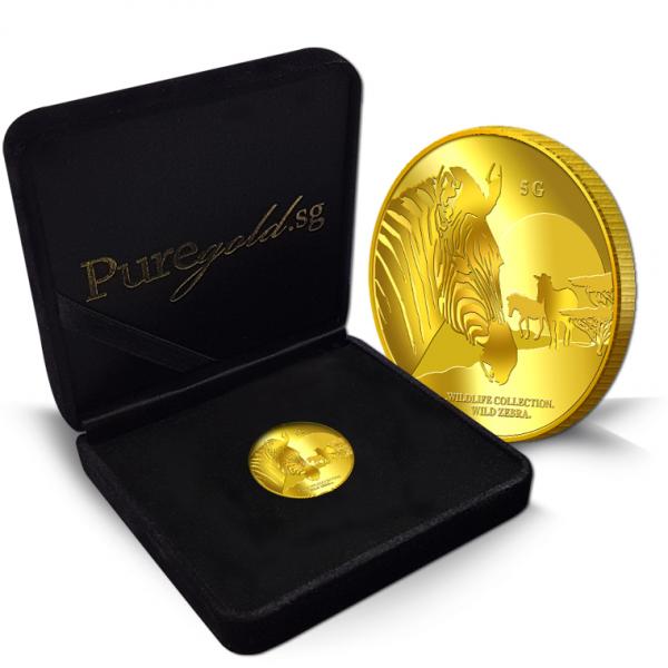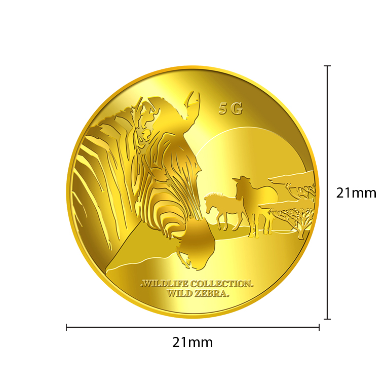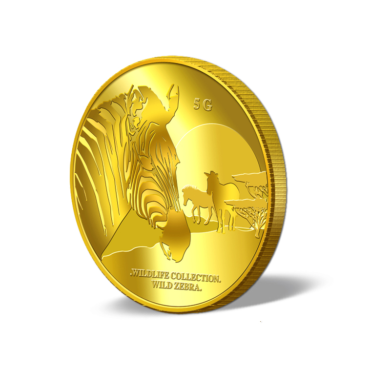 The image of a zebra is embossed on a 5g 999.9 fine gold.