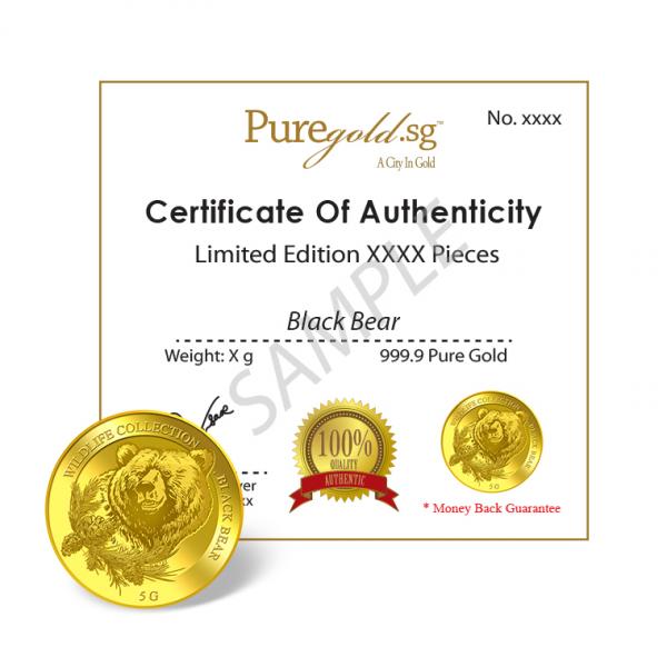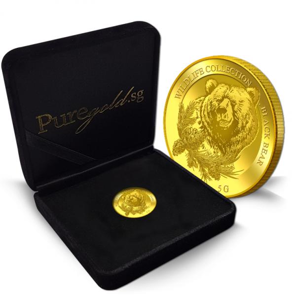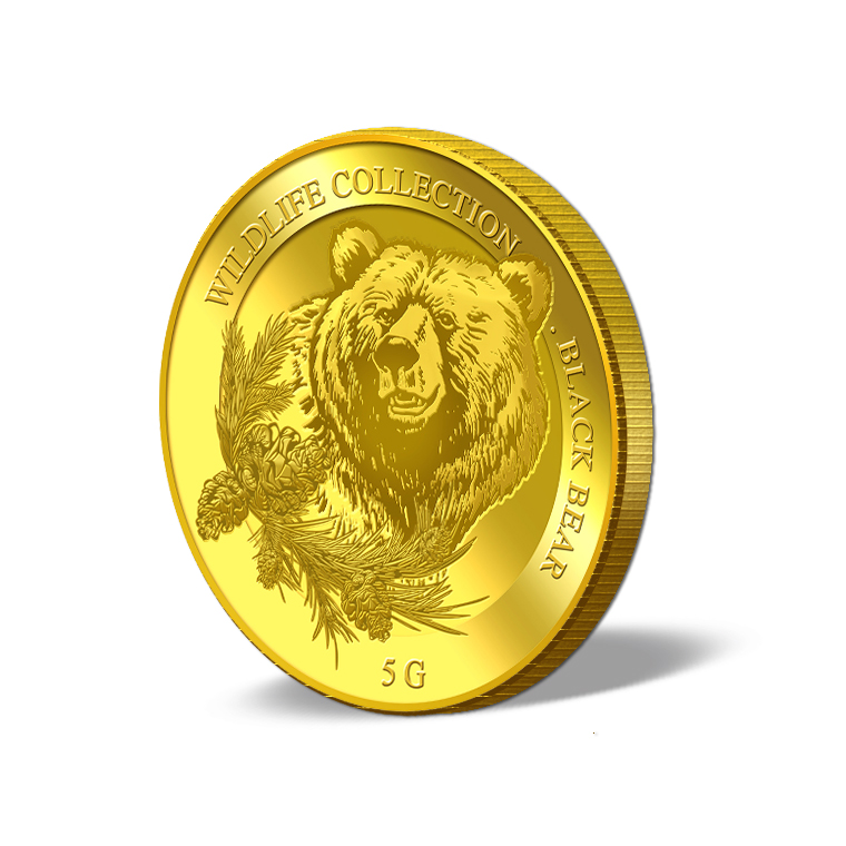 The image of an emerging black bear is embossed on a 5g 999.9 fine gold.