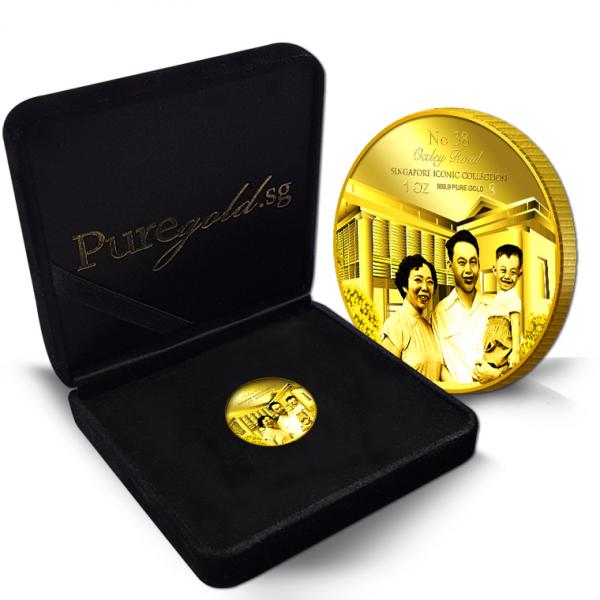 The image of Founding Father with his wife and son, and their house at 38 Oxley Road is embossed on a 1oz 999.9 fine gold Medallion.