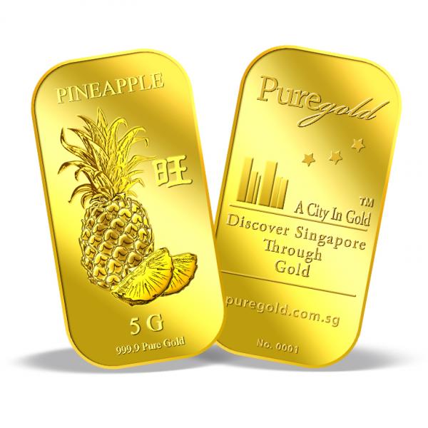 The image of the pineapple is embossed on a 5g 999.9 fine gold bar.