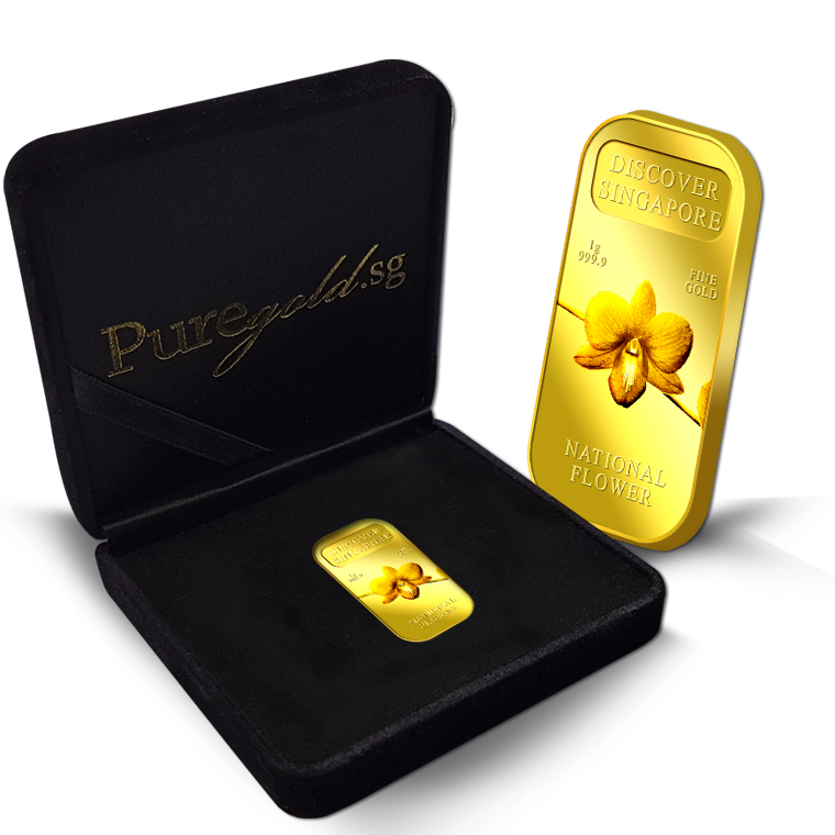The image of Singapore’s national flower, Vanda Miss Joaquim Orchid, is embossed on a 1g 999.9 fine gold bar.