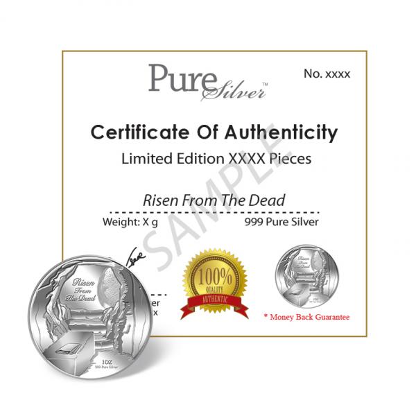 The images of Risen from the Dead are embossed on a 1Oz 999 fine silver medallion.
