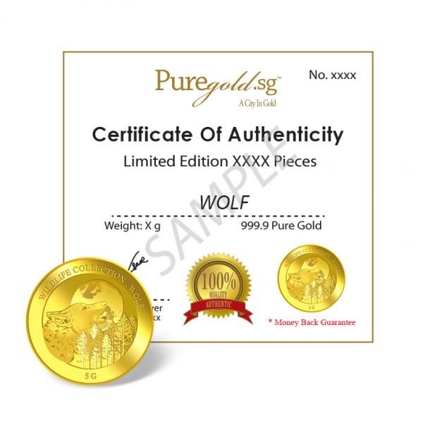 The image of a Wolf is embossed on a 5g 999.9 fine gold.