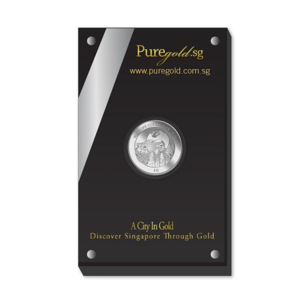 The wolf silver medallion design portrays an image of a wolf. The design also includes the inscription WILDLIFE COLLECTION, WOLF, the medallion’s weight and fineness.