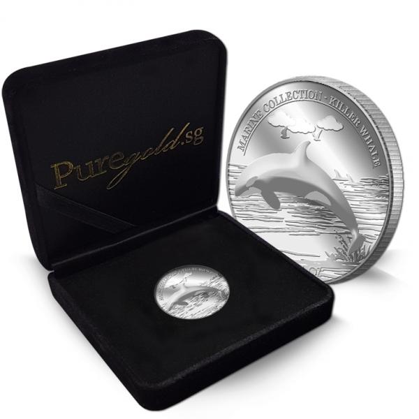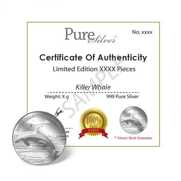The image of the Killer Whale is embossed on a 1Oz 999 fine Silver medallion.