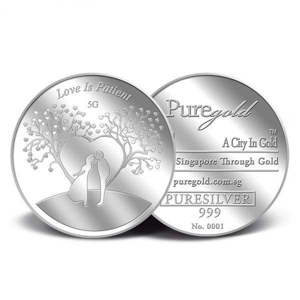 The Love is Patient silver medallion design portrays a beautiful image a groom and a bride.