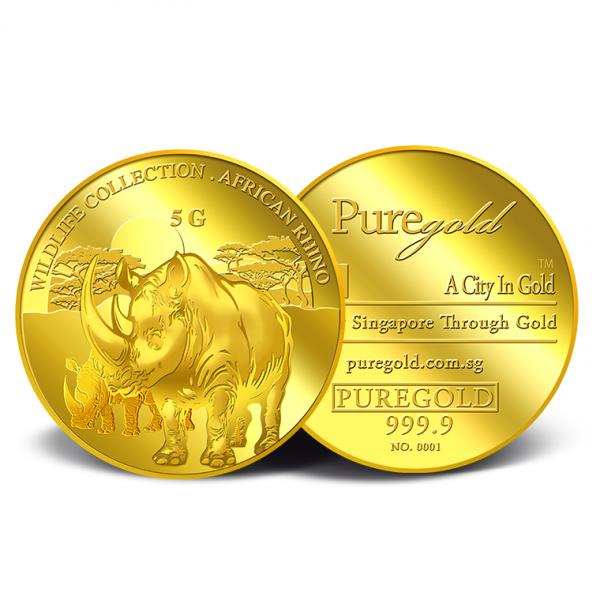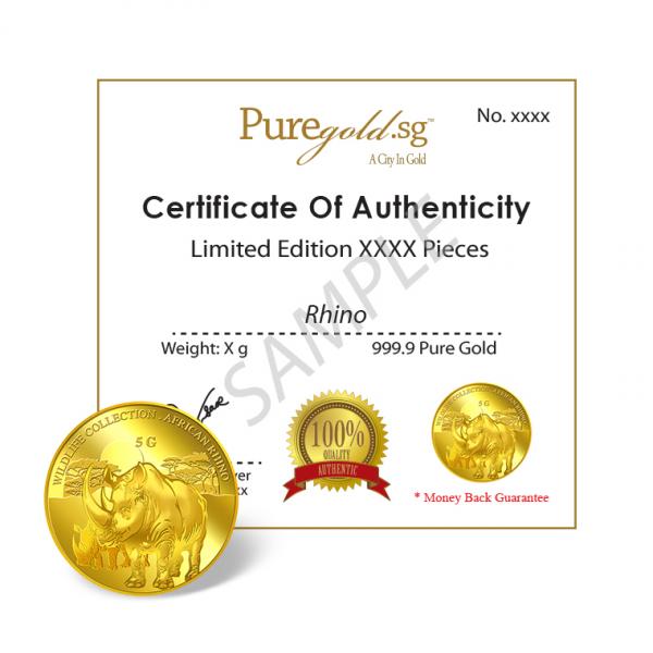 The image of a Rhinoceros is embossed on a 5g 999.9 fine gold.