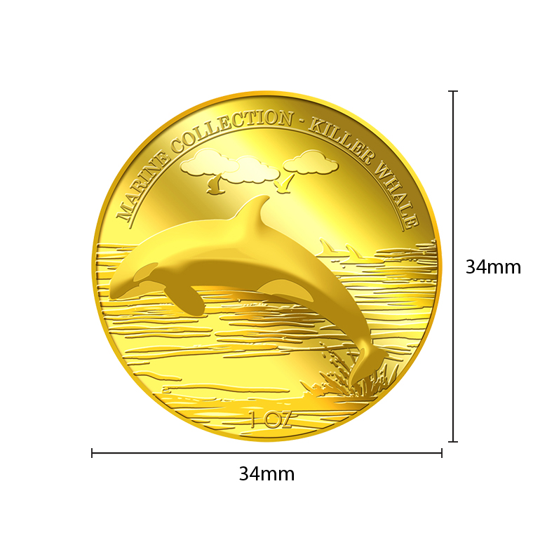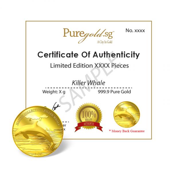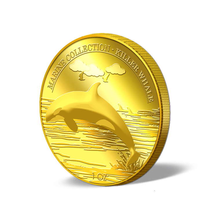 The image of the Killer Whale is embossed on a 1oz 999.9 fine gold Medallion.
