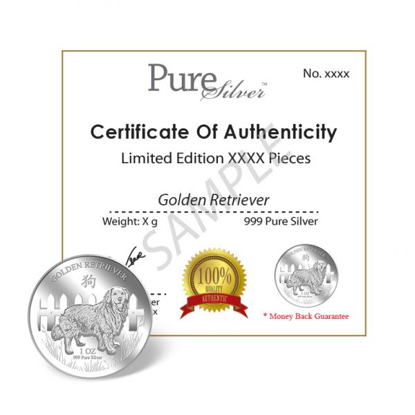 The image of the Golden Retriever is embossed on a 1Oz 999 fine silver.