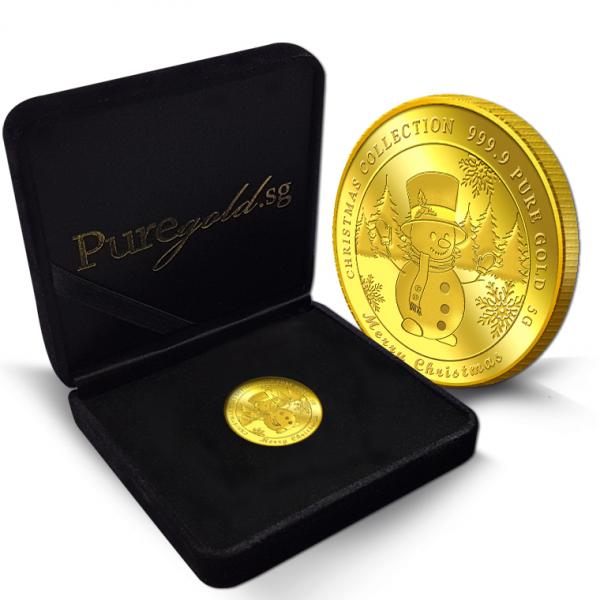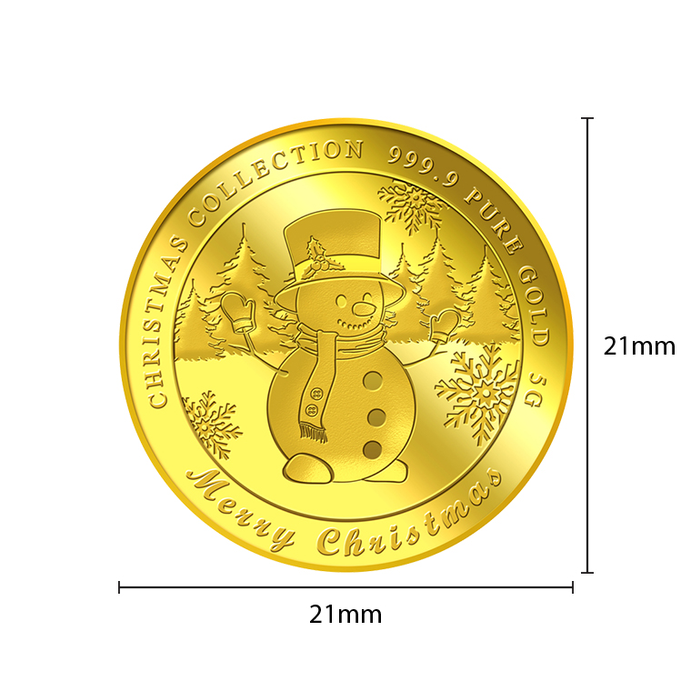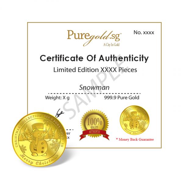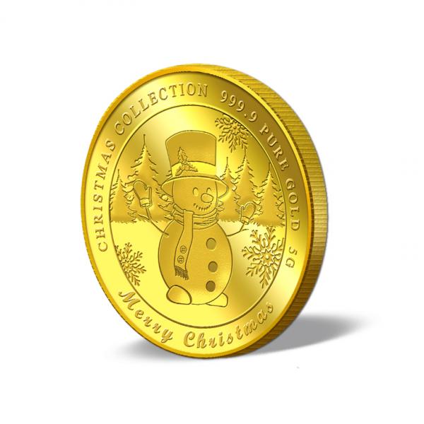 The image of Snowman is embossed on a 5g 999.9 fine gold Medallion.