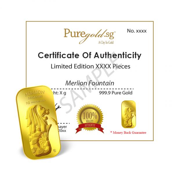 The image of Singapore’s national mascot, the Merlion, is embossed on a 1g 999.9 fine gold bar.