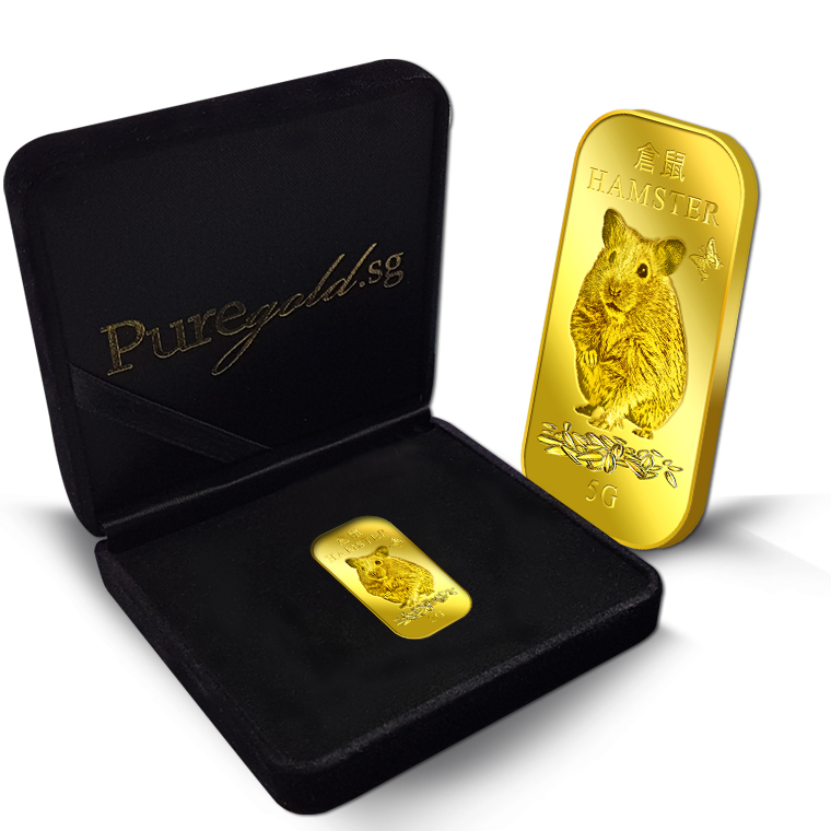 The image is embossed on a 5 grams 999.9 fine gold bar.