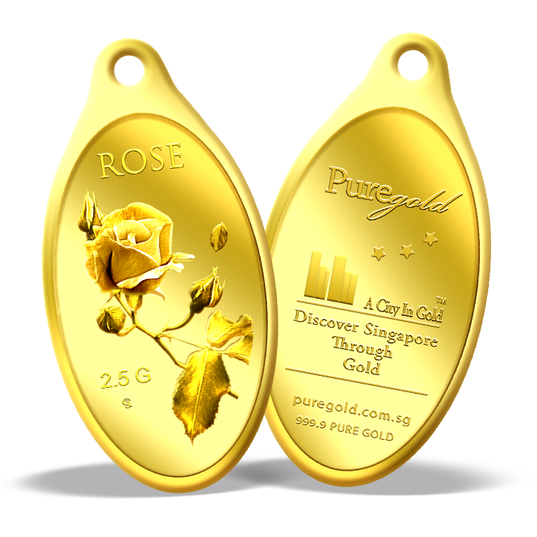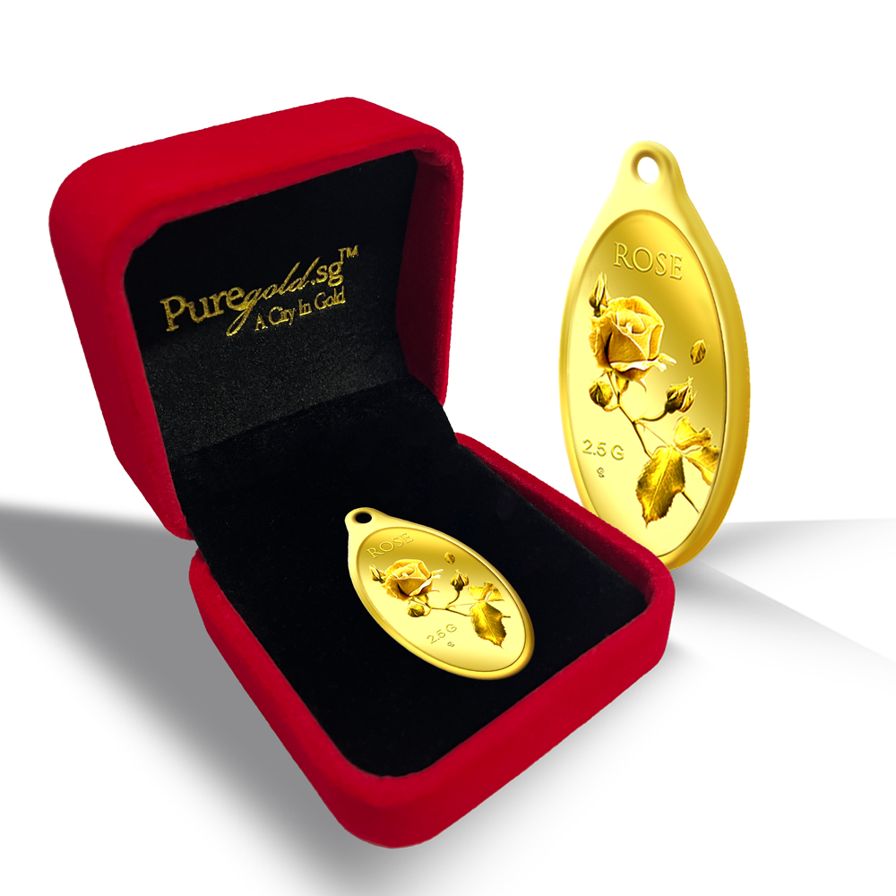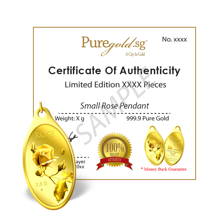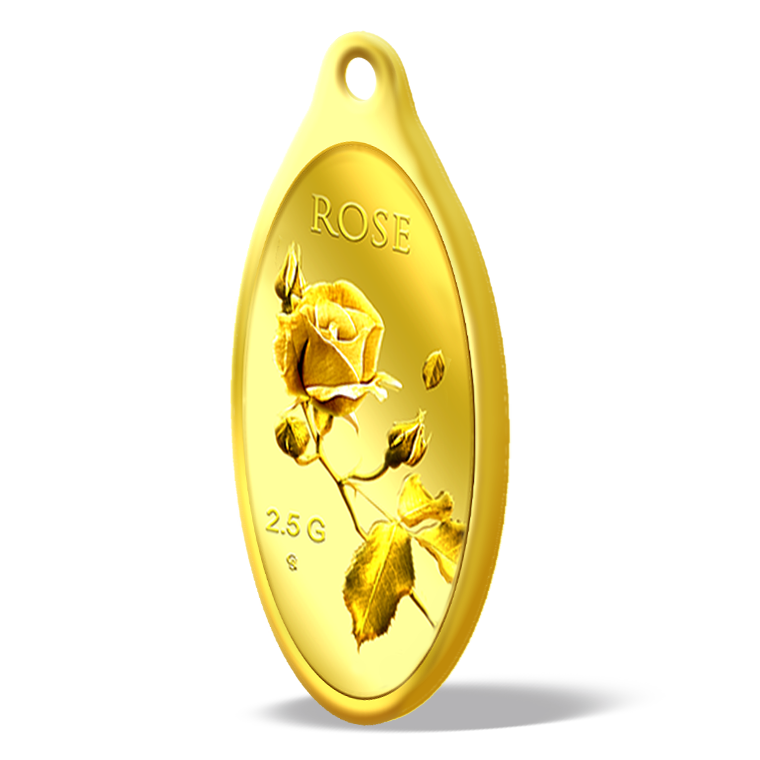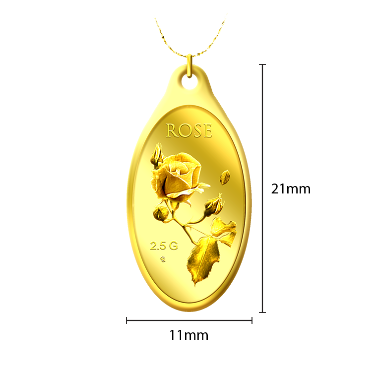 In this uniquely designed gold pendant, the big single gold rose with leaves represents joy, gladness, friendship and hope, making this gold bar a perfect gift for loved ones or close friends to show them that we rejoice in their happiness.
