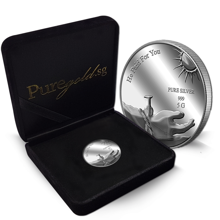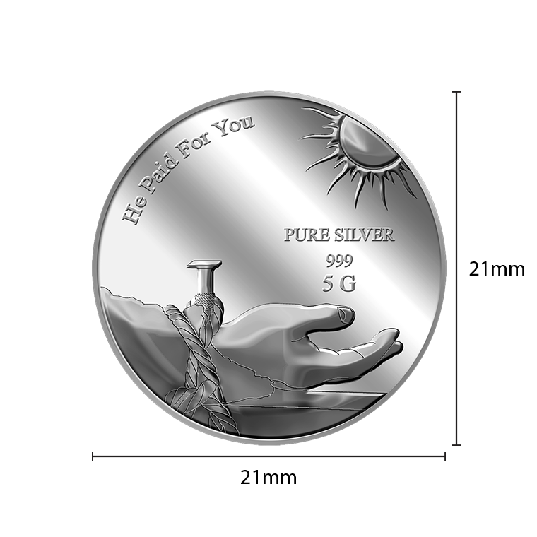 The "He Paid For You" silver medallion design portrays an image of Jesus' hand fastened to the wooden cross, and the rising sun which refers to the coming of the Lord Jesus Christ in power and great glory. The design also includes the inscription “He Paid For You", the medallion’s weight and fineness.