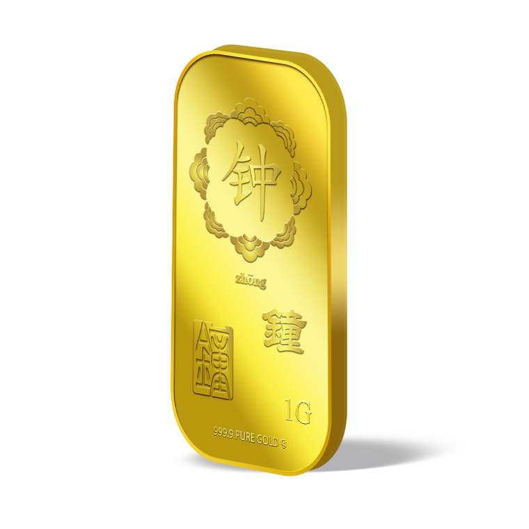The image is embossed on a 1 gram 999.9 fine gold bar.