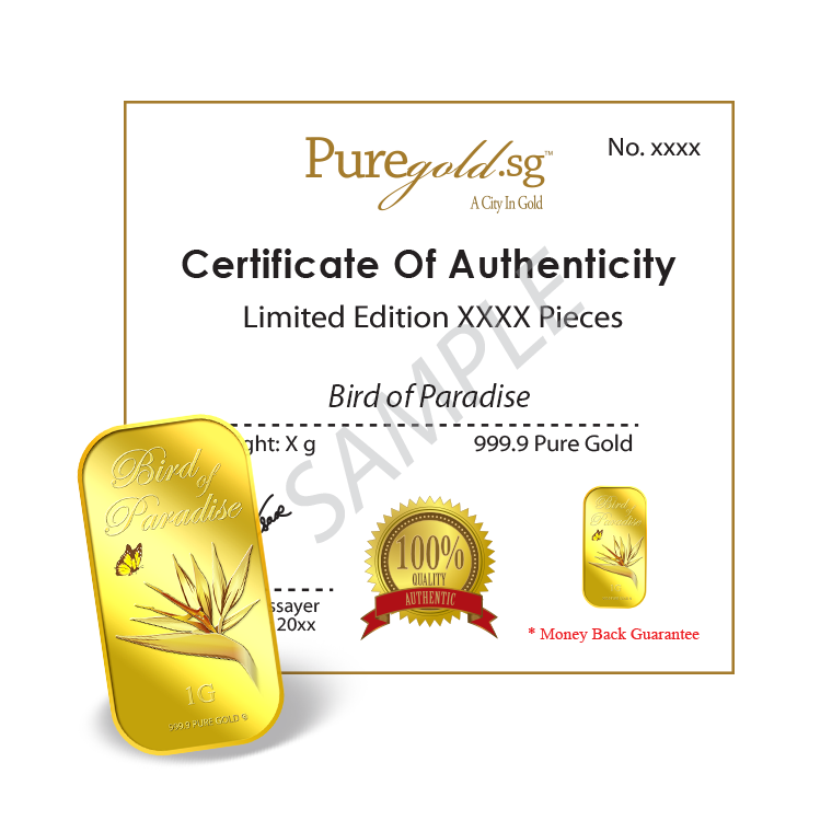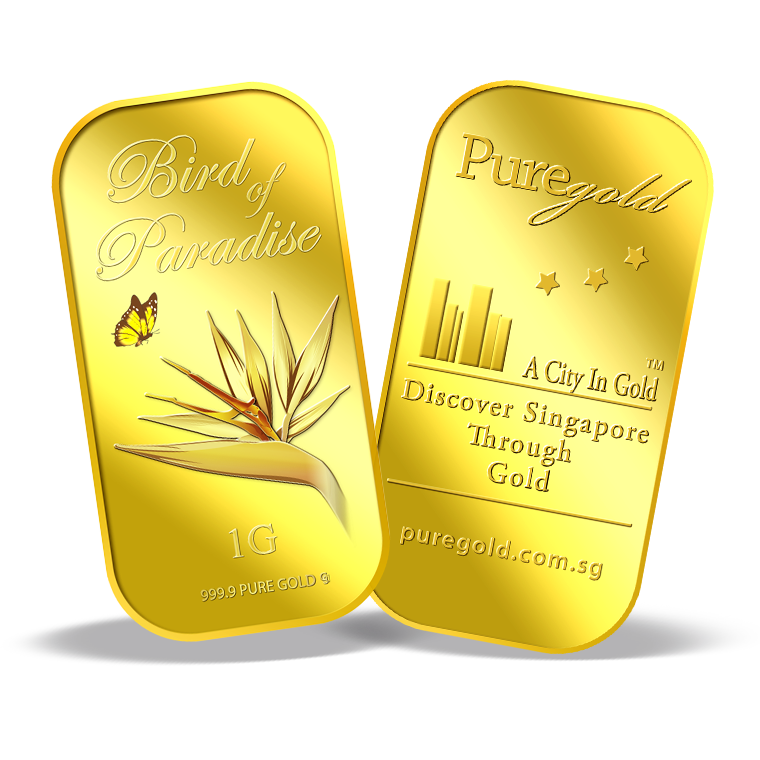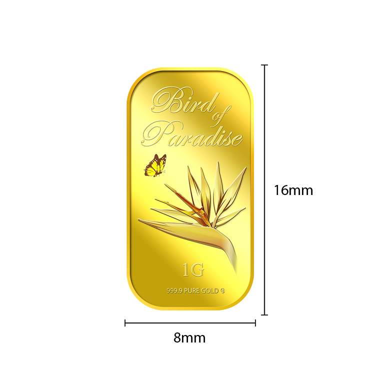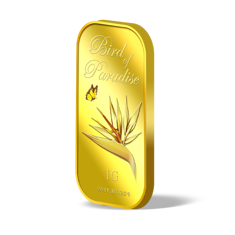 The image is embossed on a 1 gram 999.9 fine gold bar.