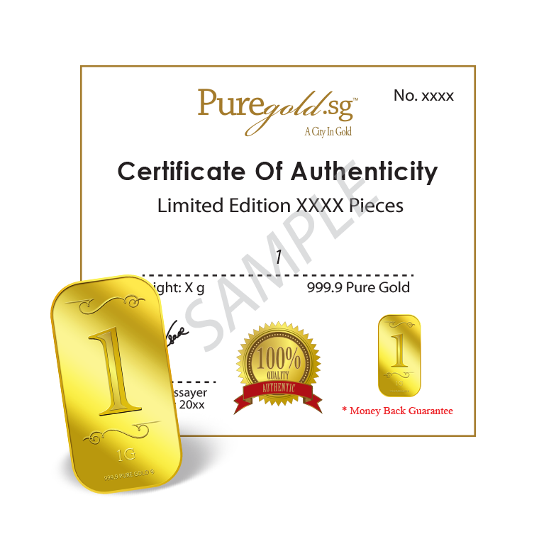 The image is embossed on a 1 gram 999.9 fine gold bar.