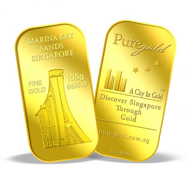 The images of Marina Bay Sands Singapore are embossed on a 100g 999.9 fine gold bar.