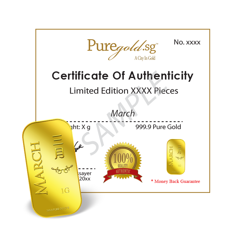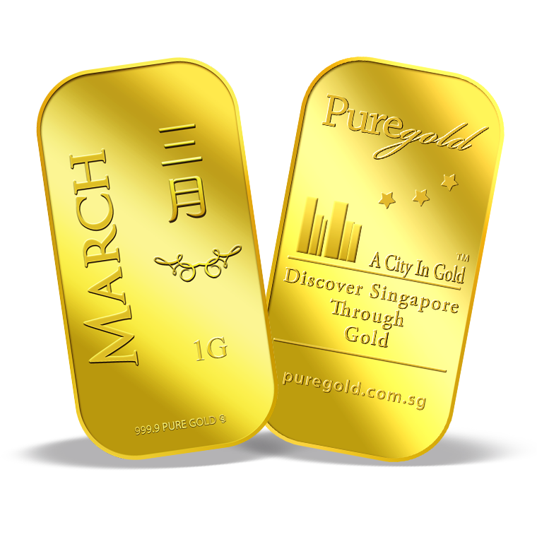 The image is embossed on a 1 gram 999.9 fine gold bar.