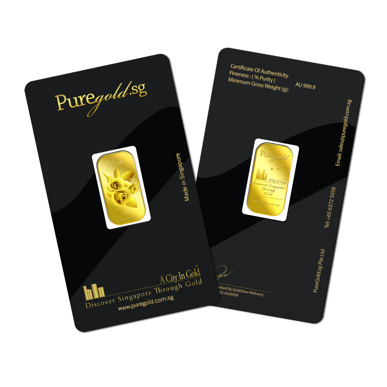 In this uniquely designed gold bar, the big single gold rose with leaves represents joy, gladness, friendship and hope, making this gold bar a perfect gift for loved ones or close friends to show them that we rejoice in their happiness.
