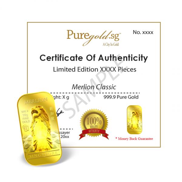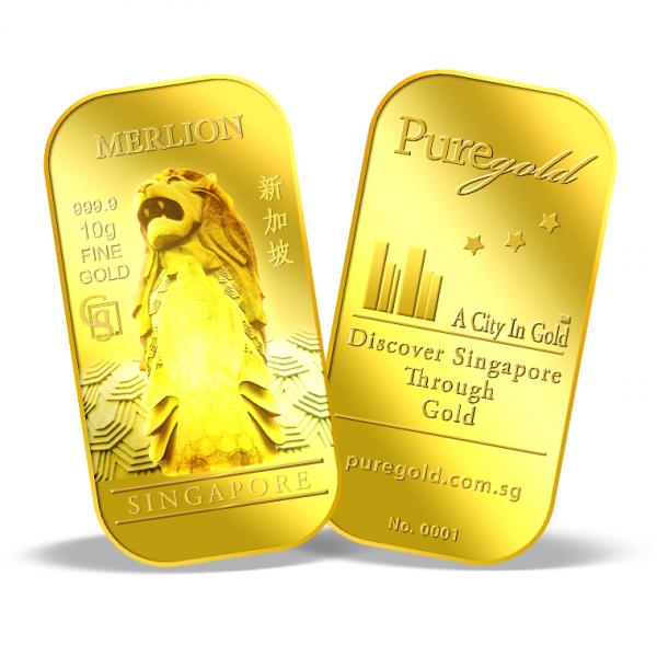 The images of Merlion are embossed on a 10g 999.9 fine gold bar.